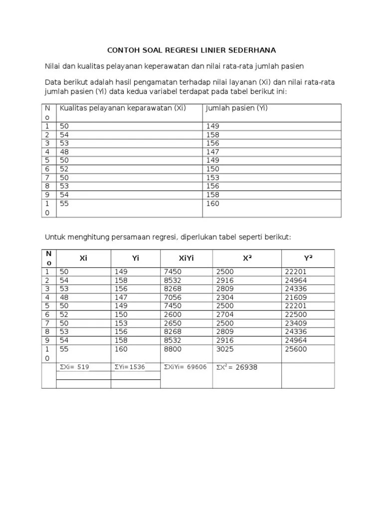 A short summary of this paper. soal esai kebudayaan 12 smk. Pengertian dan analisis korelasi sederhana dengan rumus pearson korelasi sederhana merupakan suatu teknik statistik yang dipergunakan untuk mengukur kekuatan hubungan 2 variabel dan juga untuk dapat mengetahui bentuk hubungan antara 2 variabel tersebut. contoh soal dan jawaban persamaan regresi linear sederhana. contoh soal dan jawaban metode peramalan kausal. Pada pembahasan kali ini akan membahas mengenai forecasting. Y a b x maka persamaan regresi dalam soal ini adalah. Suatu riset dilakukan oleh sebuah mall yang mempunyai banyak cabang usaha. Detail contoh soal dan jawaban diagram pencar statistik pdf dapat kamu nikmati dengan cara klik link download dibawah dengan mudah tanpa iklan yang mengganggu. Kelas ipa 1 ipa 2 dan ipa 3 memiliki jumlah siswa 35 32 34 dan diketahui rata rata gabungan nilai matematikanya adalah 54 3. Data diambil selama 24 jam secara berurutan pada tanggal 17 april 2009. contoh soal dan jawaban metode least square ganjil dan genap. regresi linear sederhana adalah model prediksi yang digunakan pada data berskala interval atau.