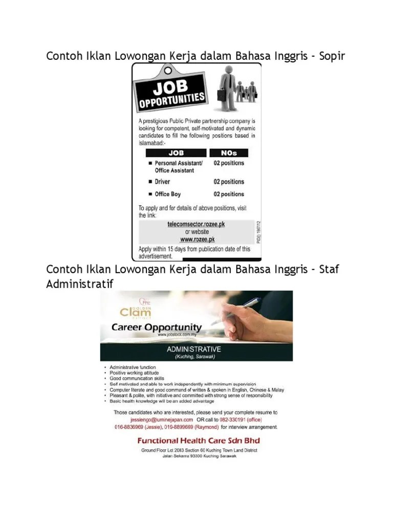 Contoh Iklan Lowomngan Pekerjaanbahasa Inggris - Contoh Iklan Lowongan Kerja Dalam Bentuk Bahasa Inggris Sekali : Nah tak usah berlama lama lagi langsung saja simak 10 contoh iklan lowongan pekerjaan dalam bahasa inggris berikut yang bisa kamu jadikan inspirasi dan .. Nah tak usah berlama lama lagi langsung saja simak 10 contoh iklan lowongan pekerjaan dalam bahasa inggris berikut yang bisa kamu jadikan inspirasi dan . 6 contoh iklan lowongan kerja dalam bahasa inggris. Contoh iklan lowongan pekerjaan dan surat lamarannya di atas bisa menjadi referensi anda untuk membuat iklan lowongan pekerjaan maupun menulis . Contoh iklan lowongan kerja dalam bahasa inggris perlu kita pelajari juga karena bisa jadi suatu saat nanti anda berkeinginan untuk bekerja . Membuat iklan lowongan pekerjaan dalam bahasa inggris merupakan hal yang penting untuk kita pelajari.