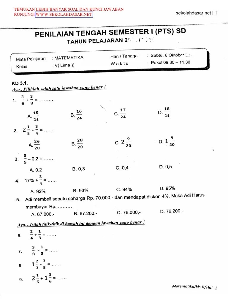 Nah bagi contoh soal uts/pts (penilaian tengah semester) dan (ulangan tengah semester) pada mata pelajaran matematika untuk kelas 5 sd/mi kurikulum 2013 / k13 .